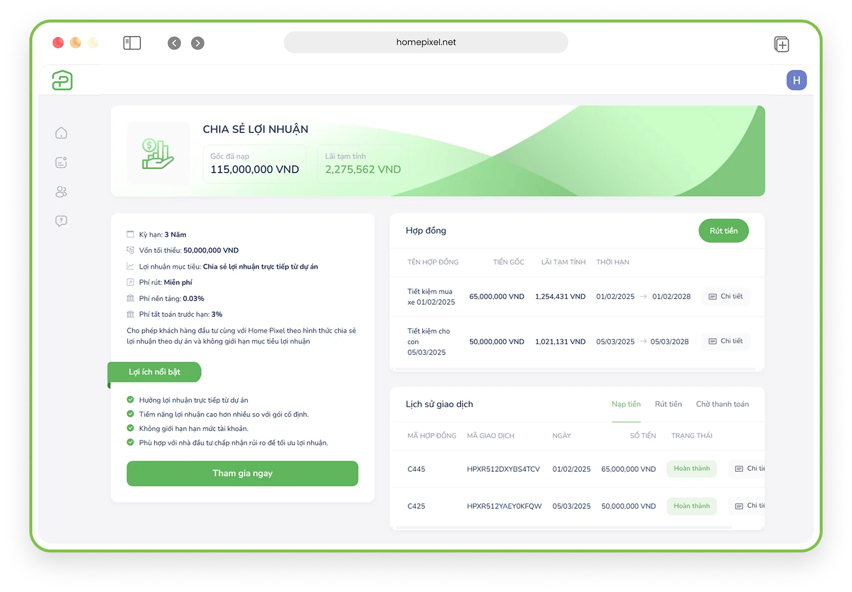 More detailed information (such as withdrawal fees, cash flow management, and profit reports...) will only be available once you’ve registered an account and logged in at invest.homepixel.net.